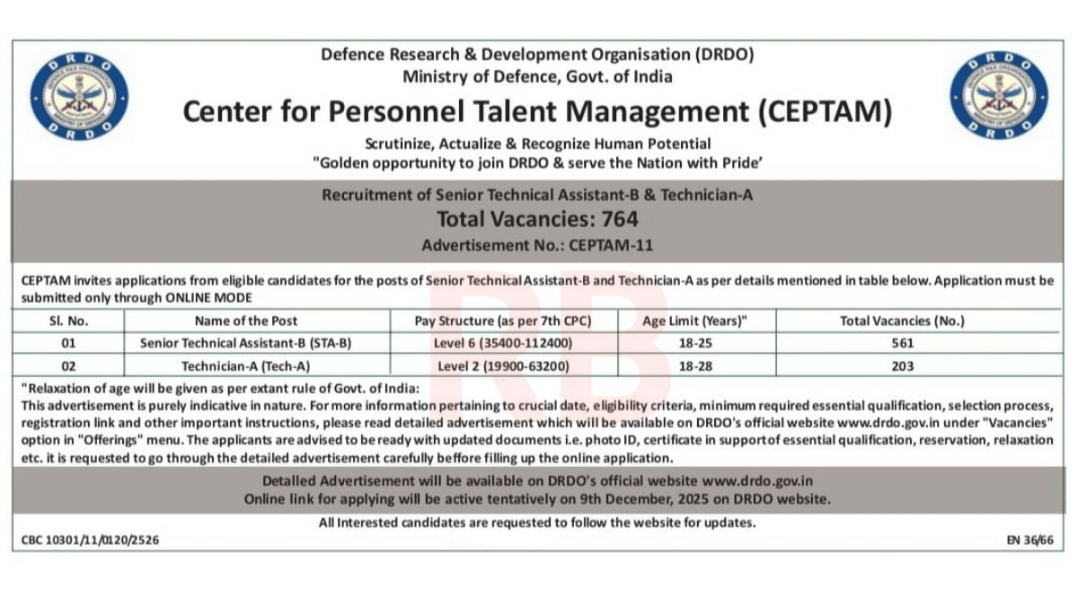 - DRDO ने CEPTAM 11 Recruitment 2025 के लिए कुल 764 पदों का आधिकारिक शॉर्ट नोटिफिकेशन जारी कर दिया है।