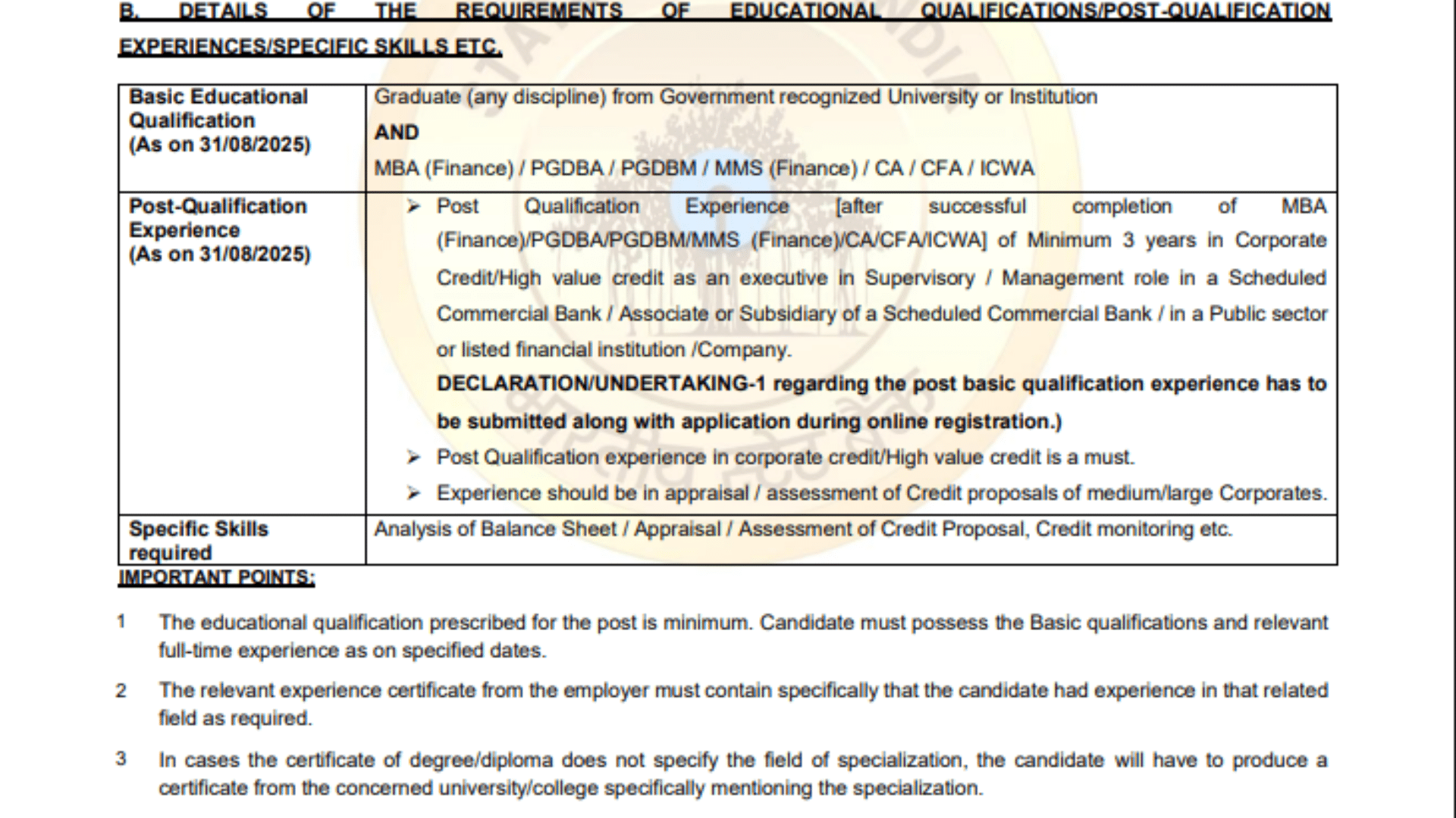- अन्य Specialist Cadre Officer के लिए: MBA/CA/ICWA या समकक्ष डिग्री।